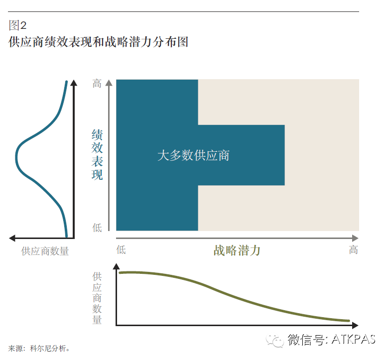 在现实情况下,供应商在这两个坐标上的分布并不成直线形。如图2所示,供应商在业绩表现坐标上的分布呈钟形或正太分布。大多数供应商的表现处于平均水平。而在战略潜力坐标上,分布更倾向于左侧,即大多数供应商将与公司建立成熟的关系,在短期内不会造成异常事件。但是,也会有一些供应商具备特别大的战略潜力。